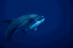 フィンの先を揃えて、音をたてないように海にすべりこみます。まず少し泳い で船から離れましょう。そばにいると、急に船が動いたとき危険です。まわり をよく見ながら泳いで、イルカが見えたら早速潜りましょう。イルカが見えな くても・・・やっぱり潜ってみましょう。潜っている人にイルカは興味を示し ますから、とりあえず潜ってみたらイルカが後ろから ビュン、ということもあります。