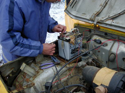 それはツーリングでの出来事、温泉に入ろうと車をとめたらエンジンがかからない。みんなでよってたかって見てみると替えたばかりの電磁ポンプが作動していない。 今回は家が近かったので他の車輌で牽引して行きました。 その途中牽引ロープが切れ、別のロープで牽引しました。 今回の教訓:最初の故障に対するコメントは?ですが、牽引ロープは耐荷重の大きな物にしましょう。又ロープがささくれだったら切れる合図と考え新しい物を準備しましょう その後の話だと電磁ポンプを2個購入し、予備を車に積んであるそうです。 |