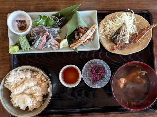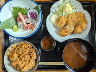岡崎・平の屋さんの18回目です。店長おすすめメニューが一段落したので、定型メニューの中でまだ食していない2品と、店長おすすめ、サンマの刺身定食です。サンマの刺身は新鮮でなければいただけない、北海道から空輸されたものだそうです。