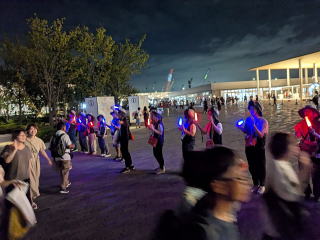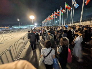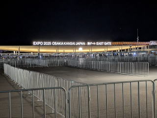 万博入場者21万人超のこの日、退場後の帰路もたいへんな人混みです。退場ゲート前、万博スタッフの人たちが、トーチを振りながら見送ってくれているのが印象的でした。ゲートを出てから夢洲駅まで行き着くのにもすごい待ち行列、少し歩いては止まるの連続で、30分以上の時間がかかりました。しかし、地下鉄は数分おきに来るために、そんなにストレスは感じませんでした。