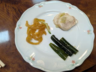 前菜3種【蒸し若鶏・くらげの酢物・きゅうりの甘酢漬け】 | ふかのひれ煮込みスープ | 揚げ物2種【湯葉皮春巻・貝柱入り揚げ春巻】 |