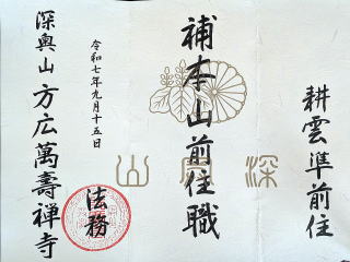法階とは、各宗派における僧の位をいいます。臨済宗方広寺派においては、13の法階があります。下から、沙弥→侍者→座主職→首座職→座元職→準西堂職→西堂職→東堂職→準前住→前住職→再住職→歴住職→特住職となります。法階により、身につける法衣等が変わります。私は、今まで準前住でしたので、手続きを行い前住職になりました。そのための辞令が本山から交付されました。