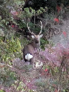 鹿の撮影成功 境内や畑に毎日出没して、緑色の葉を食し、鹿の食害に悩まされいます。昨日の早朝、その鹿が、裏山に仁王立ちしている姿を写真におさめることができました。集団で行動している一頭だけが前面に姿を見せており、その後仲間たちと一緒に裏山に消えていきました。