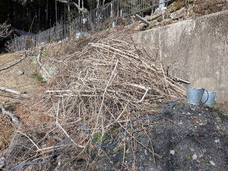 山門北梅苑焼却開始 焼却場所4箇所目にあたる山門北の梅苑において、昨日から焼却を始めました。ここには、梅の枝だけではなく、境内において業者が高所作業車で剪定した枝が山になっています。終了まで何日かかるかな?