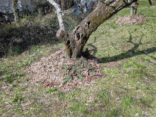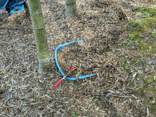 竹林ブロワー 春の訪れを前に、竹林の清掃を行っています。1年間に積もった落ち葉をブロワーで集め、梅の木の根元に持っていきます。竹林の清掃が梅の肥料となります。落ち葉のなくなった竹林で、筍が生えてくるのを待ちます。