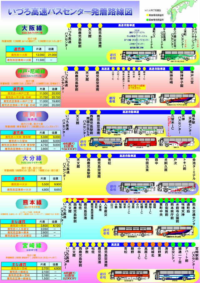 本日は鹿児島交通の高速バスをご利用いただきましてまことにありがとうございます。 長らくのご乗車大変お疲れ様でした。まもなく終点、いづろ高速バスセンター、いづろ高速バスセンターでございます。 お降りの際は車が止まってから座席をお立ちください。 お忘れ物落し物のないよういま一度ご確認ください。 まもなく終点いづろ高速バスセンターに到着いたします。 本日のご乗車誠にありがとうございました。またのご利用を心よりお待ち申し上げております。 |