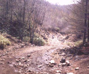 草木湖付近から根利までの小中新地林道は植林地帯 を抜ける林道で、標高1961mの袈裟丸山を駆け上がった地点には休息所があり 遠く山並みを展望できる。路面は走りやすく休日には車も多いので注意したい。