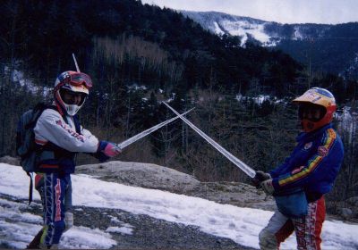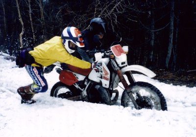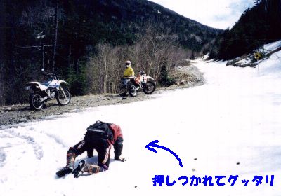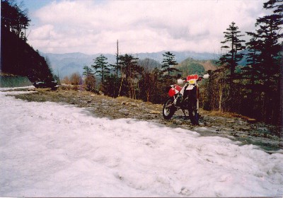 峰越・川上牧丘林道 山梨県と長野県の県境、標高2360mの大弛峠をまたぐ、約22kmの林道だ。 山梨県側が川上牧丘線、長野県側が峰越線になる。川上牧丘線はゴロゴロ石でハード、峰越線は 砂地で走りやすい。大弛峠周辺は秩父多摩国立公園と呼ばれるだけあって眺望はすばらしい。 5月の連休中でも雪の残る林道 標高が高いためGW中でも雪が残り、こんなに長いツララもできていました。