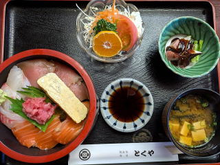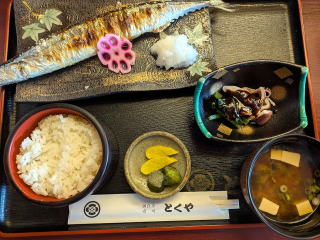 新城市長篠地区、長篠城趾のすぐ東側にある「とくや」のメニュー紹介第7回目です。定食・麺のメニューに入り、刺身定食をいただきました。次に行くと季節メニューである「サンマの塩焼き定食」が登場していました。また「3色ちらし」のネタがヒラメからタイに変わっていましたのでこれも挑戦しました。