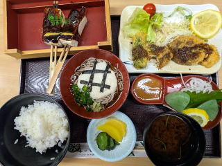 新城市門谷地区、鳳来寺山表参道中間地点にある「かさすぎ」のメニュー紹介第2回目です。定食メニューの続きを順番にいただきました。どれもボリュームもあり美味です。女城主直虎の名前を使った直虎膳には、『当店の看板メニューであるしいたけフライのしいたけに井伊家の家紋である「井」の切り込みをし、これまた人気であるとろろそばのとろろの上には、のりで「井」を表しました。「井伊の赤備え」にちなんで、赤い器をそろえ赤みそのたれのかかった田楽が二本ついています。』という説明があります。