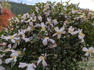 境内にある何本かのサザンカが見頃です。どの木も美しい花をたくさん付けて私たちの目を楽しませてくれています。