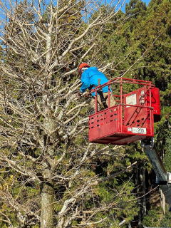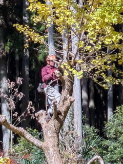 昨日、倒木処理をお願いした業者の方が、三脚を使っても届かない、背の高い植木の高所剪定をが行われました。高所作業車を使っての作業と直接木に登っての作業です。一日がかりで、サルスベリとイチョウ2本の高所剪定が終了しました。私ではとうていできそうもない仕事を熟練した職人さんたちが手際よく作業を行ってくれました。