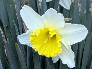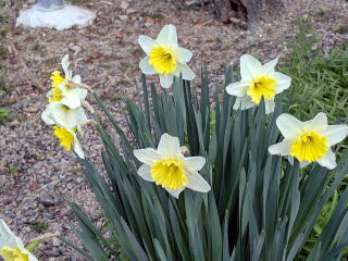 スイセン 境内の一角にスイセンの花が美しく咲いています。数年前までは、境内のあちこちに見られたのですが、シカが食するためめっきり減ってしまいました。スイセンの葉は毒があるといわれていますが、シカにとっては、そんなことはおかまいなしのようです。目にまぶしい黄色が春の訪れを示しています。