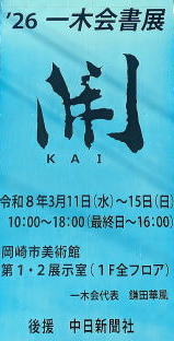 今年から単独書展に一新した一木会書展「開」が岡崎市美術館で、3月11日(水)から15日(日)まで開催されています。関係者が出品しているので鑑賞に行ってきました。この書展は、臨書から創作作品まで幅広い書がそろう展覧会、そして書を身近な生活に取り入れたコーナーもあることが特徴です。