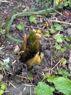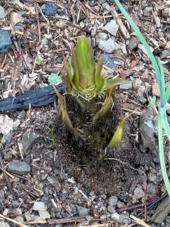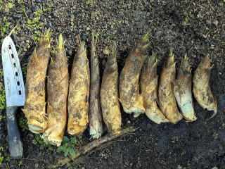 初筍ゲット まだ早いかなと思いつつ早朝竹林に行ったところ、こぶりの筍がいくつも頭を出していました。早速、筍をほりあげました。ごくこぶり筍が10本ほど収穫できました。早速、その日の昼食から筍がメニューに加わりました。