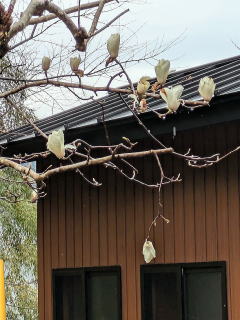 今年のハクモクレン 今年のハクモクレンは寂しい結果です。秋の剪定時に業者がばっさりと枝の剪定をしました。今年の花はがまんしてくださいとの業者の弁。その通りさびし結果になりました。