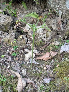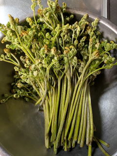初ワラビ 昨日、ワラビがもうそろそろと思い、毎年ワラビが収穫できる畑に行きました。すでに多くのワラビが顔を出していました。例年に比べると、時期的にも早く、初ワラビとしては大きく感じました。初ワラビ250gを収穫しました。